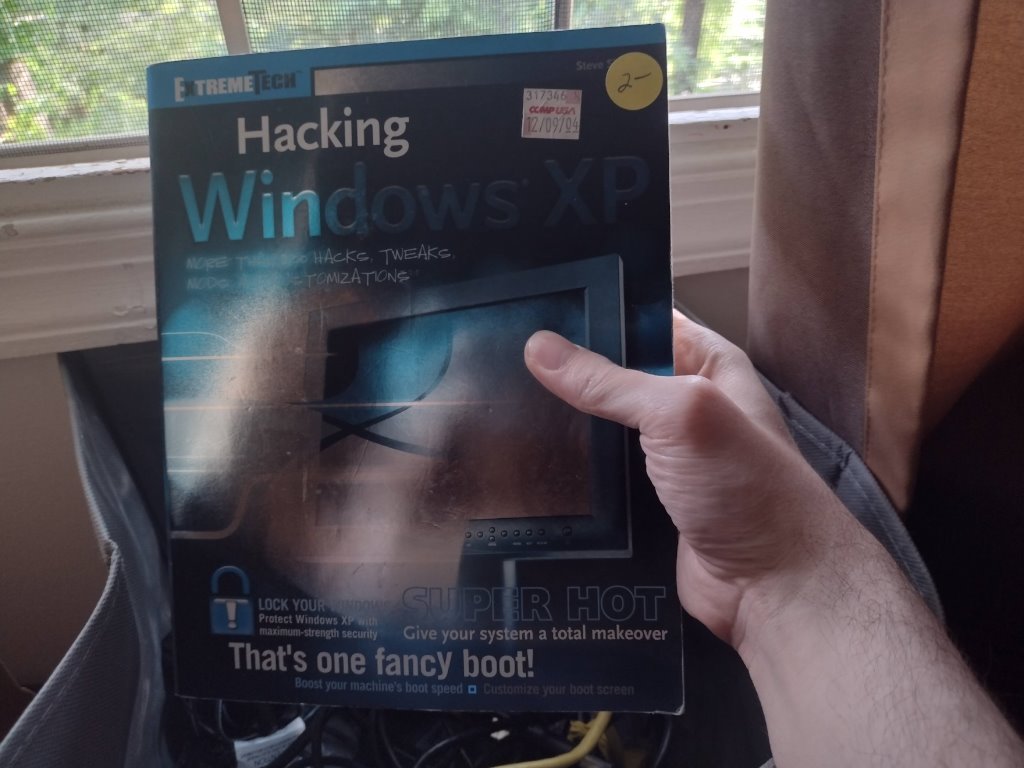 We had our annual local library sale earlier this month! If you’re curious what all I got (it was an especially good haul for weird alternative CDs), you can go read the journal post I wrote on cammy.somnol about it. One of the books everyone, including myself, was most interested in though was a book called Hacking Windows XP, written by Steve Sinchak, the maintainer of tweaks.com to this day, and published by Wiley in their ExtremeTech range. (Wiley, if you don’t know, are the folks that publish those For Dummies books that were the main way I got into retrocomputing as a very small child. I had another of their ExtremeTech books on building an arcade cabinet as well.) What’s especially fun about my copy is the CompUSA price tag on the front that says it was marked down to half off in December of 2004. History!