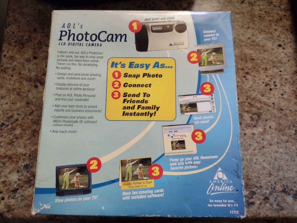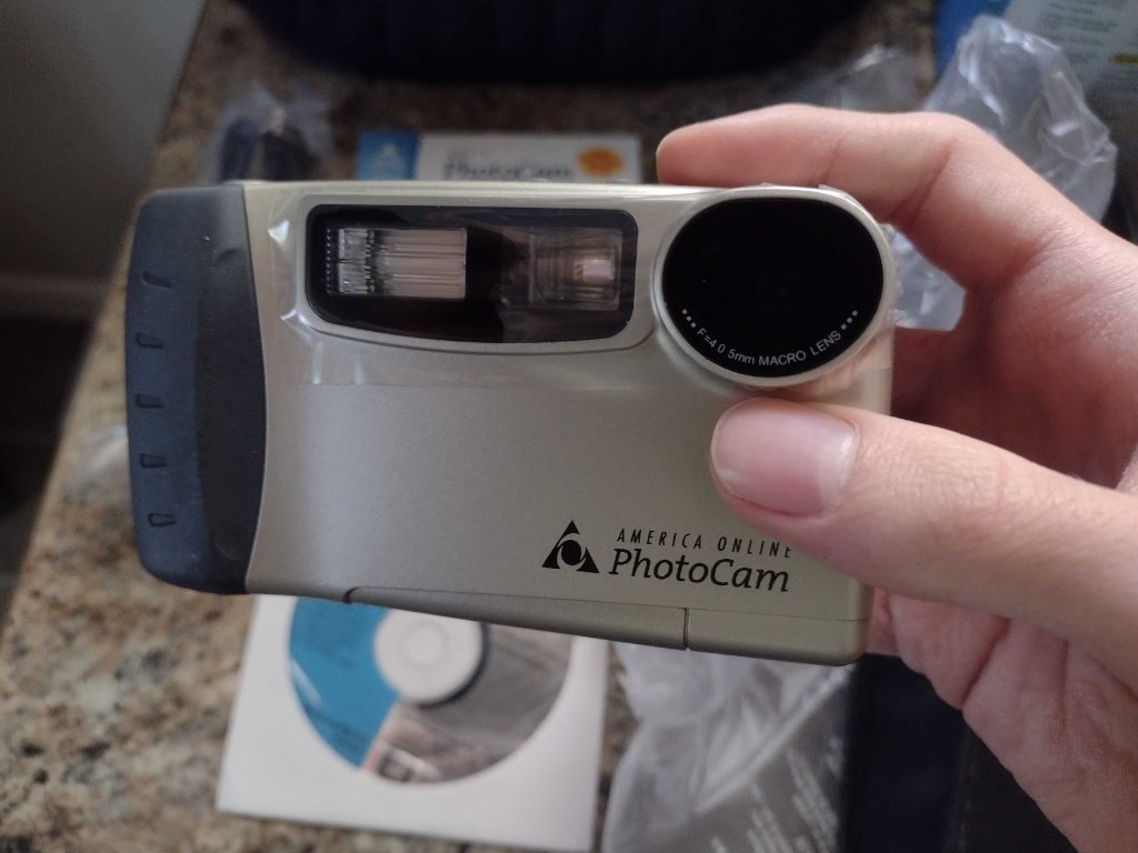 A bit of digging around on retro digicam museum sorta sights led me to the AOL PhotoCam, and it seemed perfect. It hit all the right boxes, units were cheap online, and it was AOL-branded dammit, so old people might go “ooh I remember that” while I’m out using it. The Digitalkamera Museum (a very good website for digicam history) even described it as