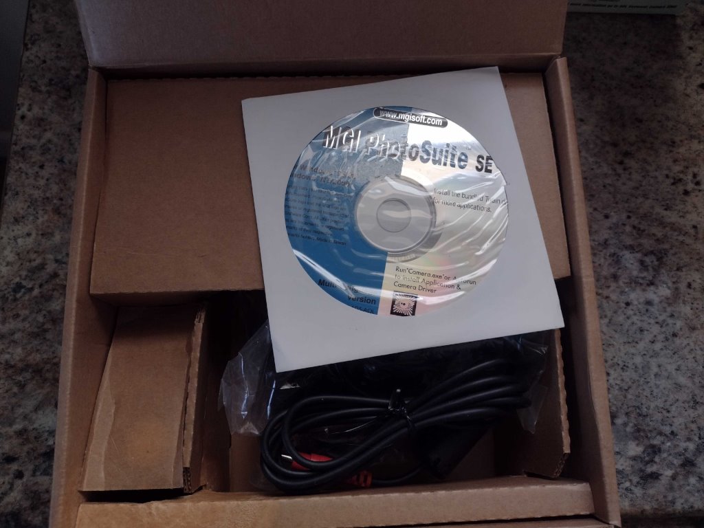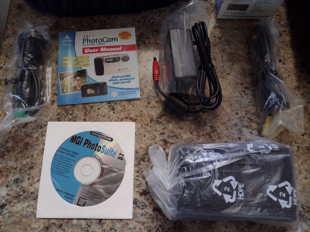 Inside the box, in a thicker inner cardboard box that keeps the outer carton’s shape, you get the camera itself, an AOL-emblazoned carrying case (I now have like four of these, but I still find ’em cool), a serial cable (later units also came with a USB cable), an A/V out for your TV, an AC adapter, four alkaline batteries (which mine didn’t come with–I’m assuming our Reddit friend tossed the no doubt now-leaky ones, and that’s alright), and a “step-by-step custom manual”. What’s custom about it, dunno, but it’s full color and a fun little lookthrough. It also comes with camera drivers and MGI PhotoSuite SE, which is a photo editor and camera transfer tool, on CD-ROM.