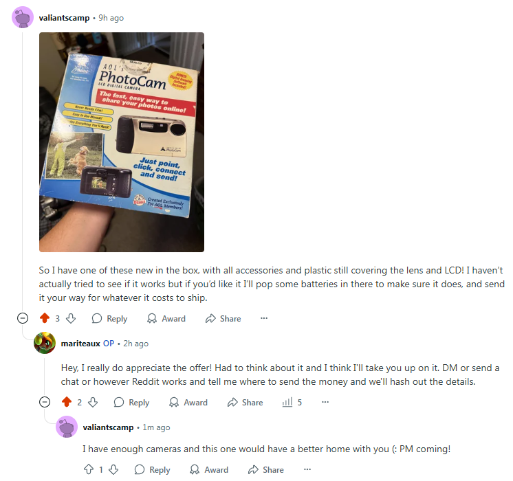 In a slightly inebriated state, I posted my story to r/VintageDigitalCameras (pretty decent sub outside of the constant barrage of people asking for cheap old digicam recommendations, as if the hunt for one yourself isn’t half the fun). I figured if anyone was going to appreciate this nightmare I went through, it’d be them, but what I wasn’t expecting to see was someone with their own PhotoCam and offering it to me: