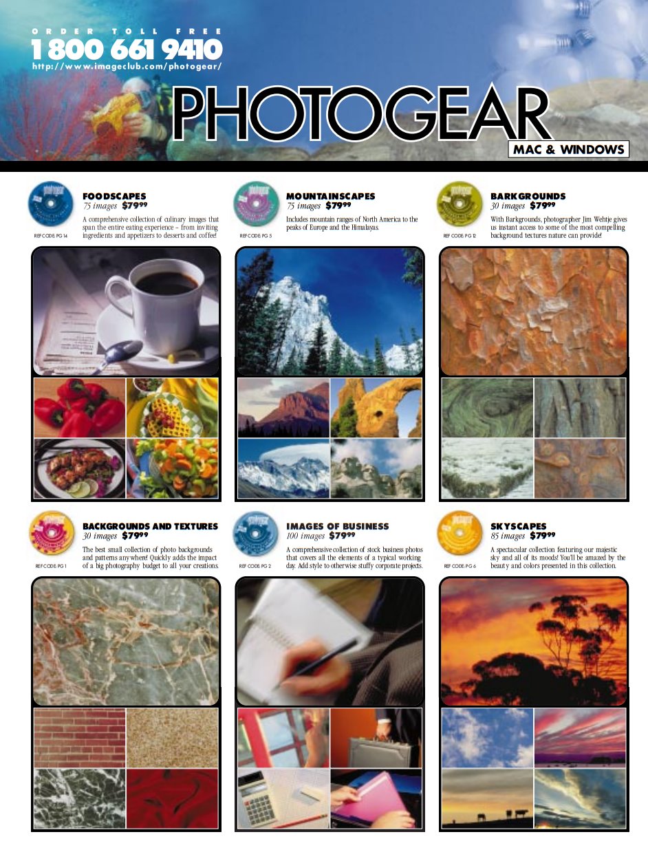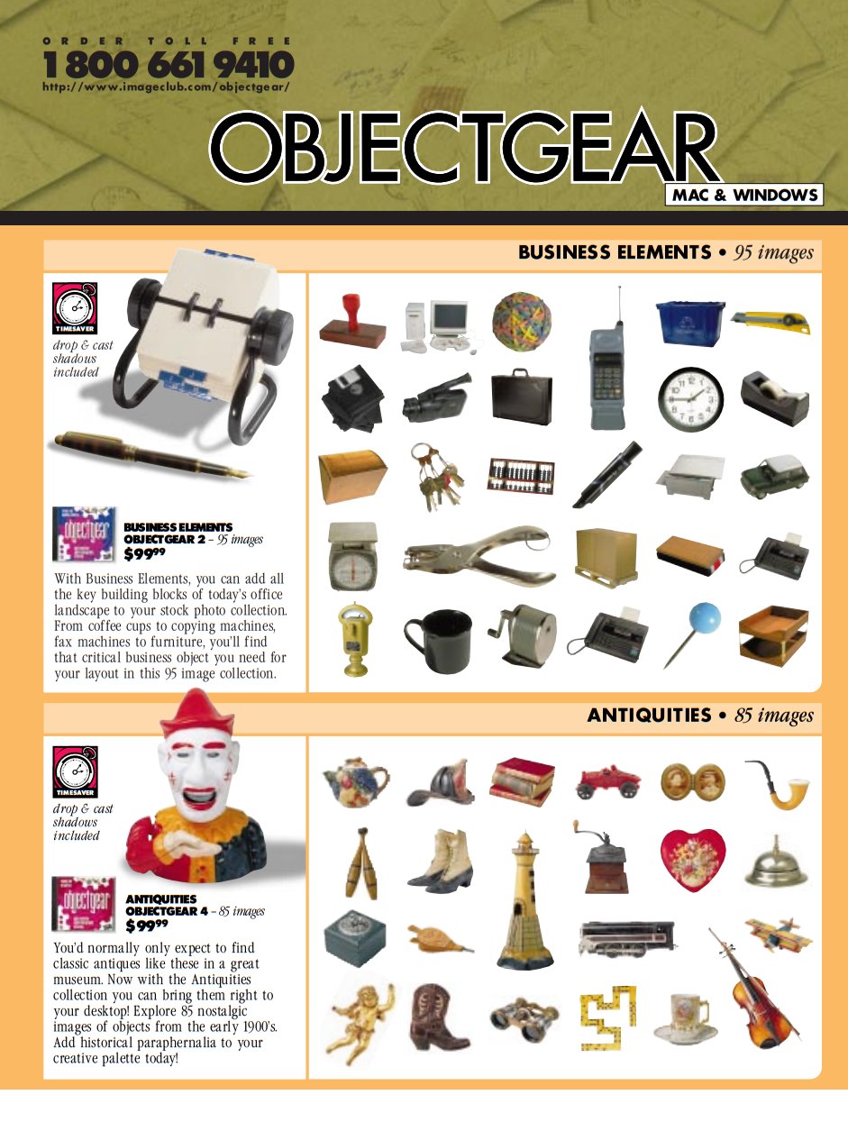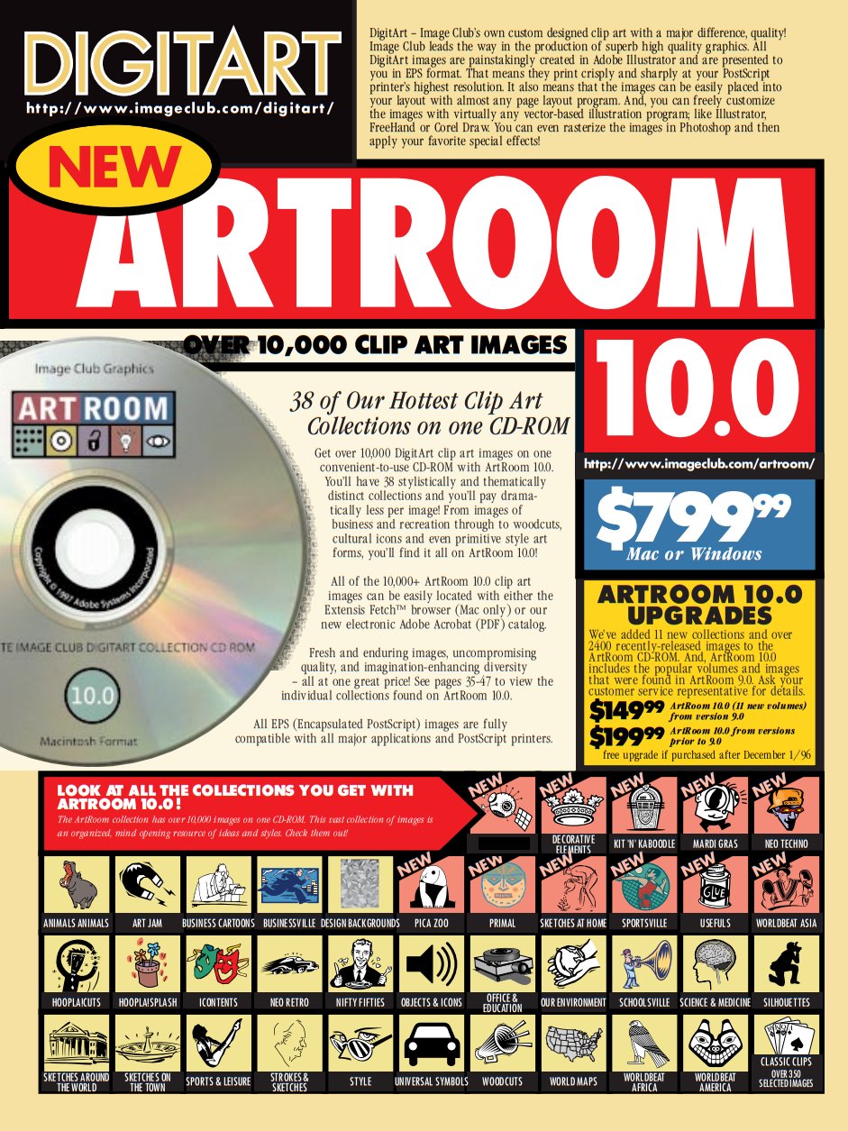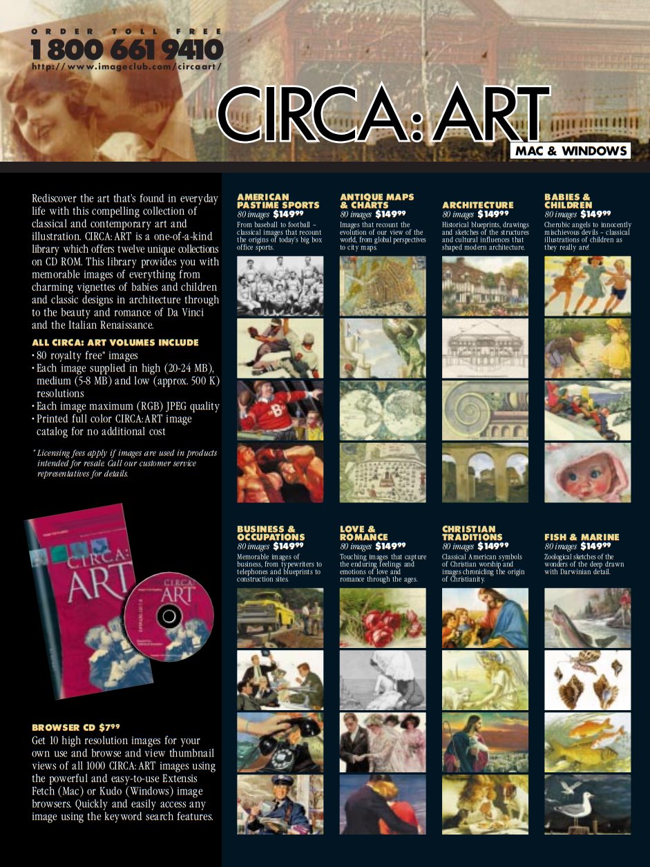 Image Club had five main ranges: DigitArt, for clip art, PhotoGear and Digital Vision, for stock photos, ObjectGear, specifically stock photos of random objects, and Circa:Art, historical stock photos. All are nicely represented here with their own full page spreads. You also get the prices of these packs, and they weren’t cheap! DigitArt Artroom, which isn’t just a clip art pack, it’s one specifically made by designers at Image Club, was $800, or $150-200 for the upgrades if you owned a previous version. Over 10,000 images, but still–that’s a spicy meatball right there. The other CD-ROM packs weren’t a ton better: $250 for a Digital Vision set, $80 for a single edition of PhotoGear, $100 for a flavor of ObjectGear, and $150 per volume of Circa:Art.