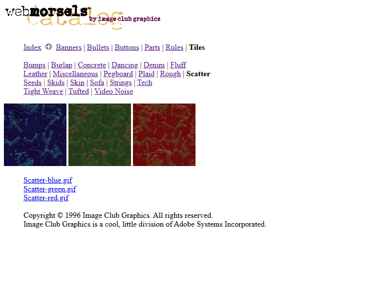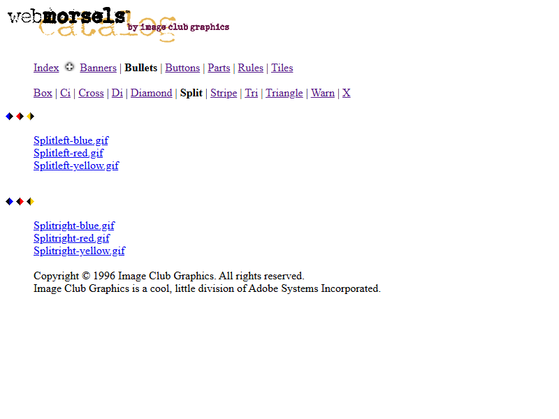 Just over a week ago, I wrote a blogpost about Adobe PageMill. The kinda tool that could only ever have existed in the mid-to-late-90s, PageMill was a boxed CD-ROM Web page builder, and I find it neat. Being an Adobe product, you can imagine it came loaded up with some Adobe extras (install Acrobat, dammit!), but some of those extras have sent me down an additional rabbit hole. Specifically, it was a pack of Web-ready bullets, rules, headers, and backgrounds under the banner of Image Club Graphics–all stuff I love and stuff I could use in my various old Web pursuits.