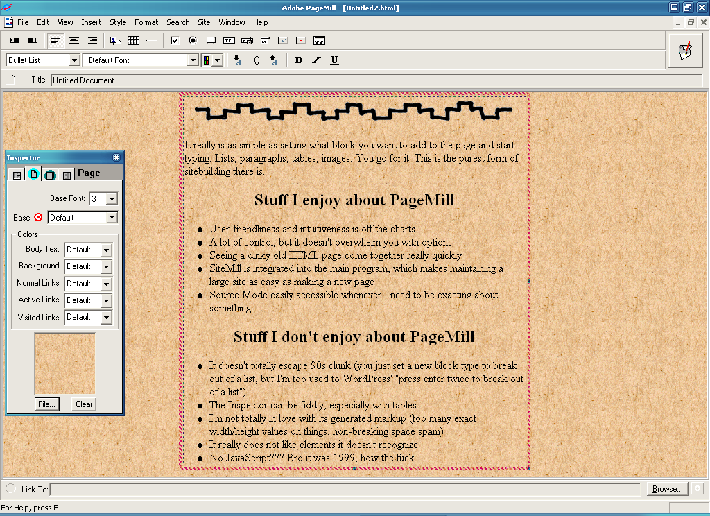 PageMill’s markup is definitely better than a lot of WYSIWYG editors. It tries to wrap stuff around 60 columns, but it’ll go for longer if it needs to. Tags are capitalized. PageMill credits itself in a <meta> tag, which I like as a Web archaeologist type. Paragraphs are properly closed (HTML doesn’t require a closing tag for paragraphs or list elements, but this helps avoid ambiguity). Presentational HTML mostly happens where you tell it to, and not wherever the editor feels like adding it.