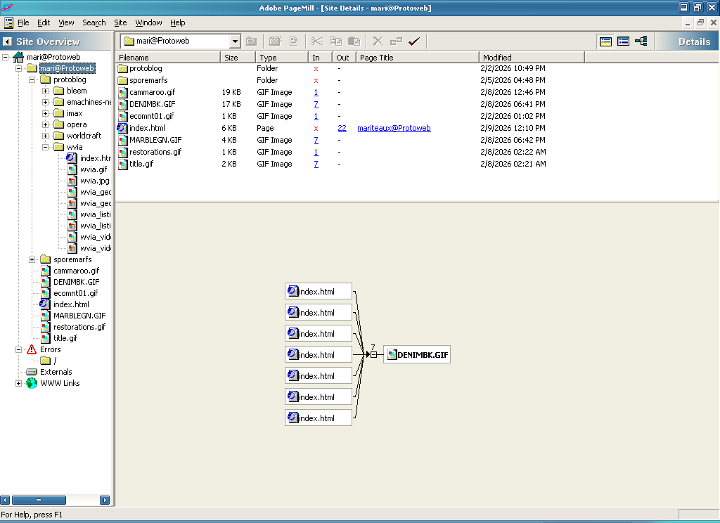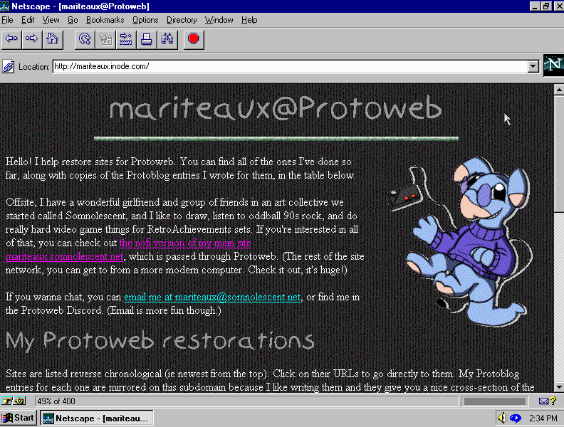 Now, my proper website (specifically the nofi flavor) is already passed through Protoweb, and I don’t need another personal site anyway. That said, I saw a purpose for mariteaux.inode.com that nothing on Somnolescent could similarly serve–a “resume” of my restorations. You see, you can pull up my author page on the Protoblog to see which sites I’ve put back together, but the Protoblog isn’t accessible through Protoweb, and that page is kind of out of the way anyway. With a little portfolio site, all my work for Protoweb could be collected in one spot with direct links to those works, complete with the history lesson writeups I do to announce each new site on the Protoblog.