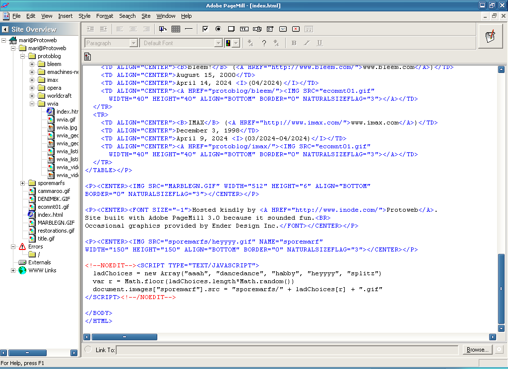 As much as I love a good wistful history lesson about the early Web, we have a site to build, so let’s go hands-on. I recently started contributing again to Protoweb, a living museum of restored early websites. One of the perks of being a contributor is that, if you request it, they’ll give you some hosting space and a subdomain or two under inode.com, which is where Protoweb’s site index lives, for whatever you’d want a Protoweb-exclusive site for. Originally, I was only interested in a subdomain for an idea I had to give people a peek behind the curtain, a blog series about the messy guts of what site restoration actually entails, but I was also given mariteaux.inode.com in the bargain.