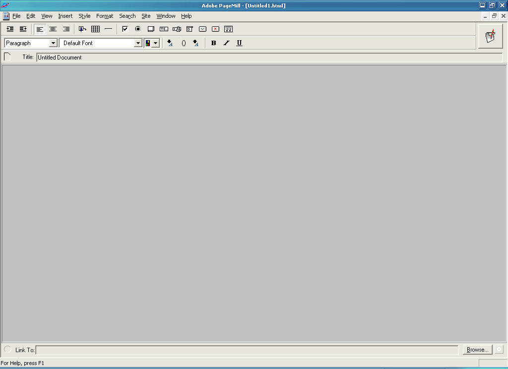 PageMill presents you with a blank page exactly like a word processor when you start. You get a few font, block type (paragraph, heading, bullet/numbered list, etc), and alignment options in two toolbars up top, plus a third for document title. Another toolbar at the bottom is for editing link destinations. Inserting images, ActiveX controls, form elements, and tables is done through the Insert menu, text styling the Style menu, and positioning the Format menu. It’s pretty intuitive, and you really don’t need a manual if you’re willing to spend five minutes clicking around, or have used a WYSIWYG editor in the past.
